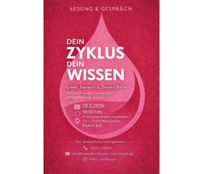 In dieser Veranstaltung dreht sich alles um Zykluswissen und Selbstfürsorge. Ausgehend von einer Lesung aus dem Buch „Dein Zyklus, dein Wissen“ vermitteln wir evidenzbasiertes, verständliches Wissen über den Zyklus und zeigen, wie dieses Wissen im Alltag stärkend wirken kann. Die Lesung ist interaktiv gestaltet und bietet Raum für Fragen, Austausch und praktische Impulse.