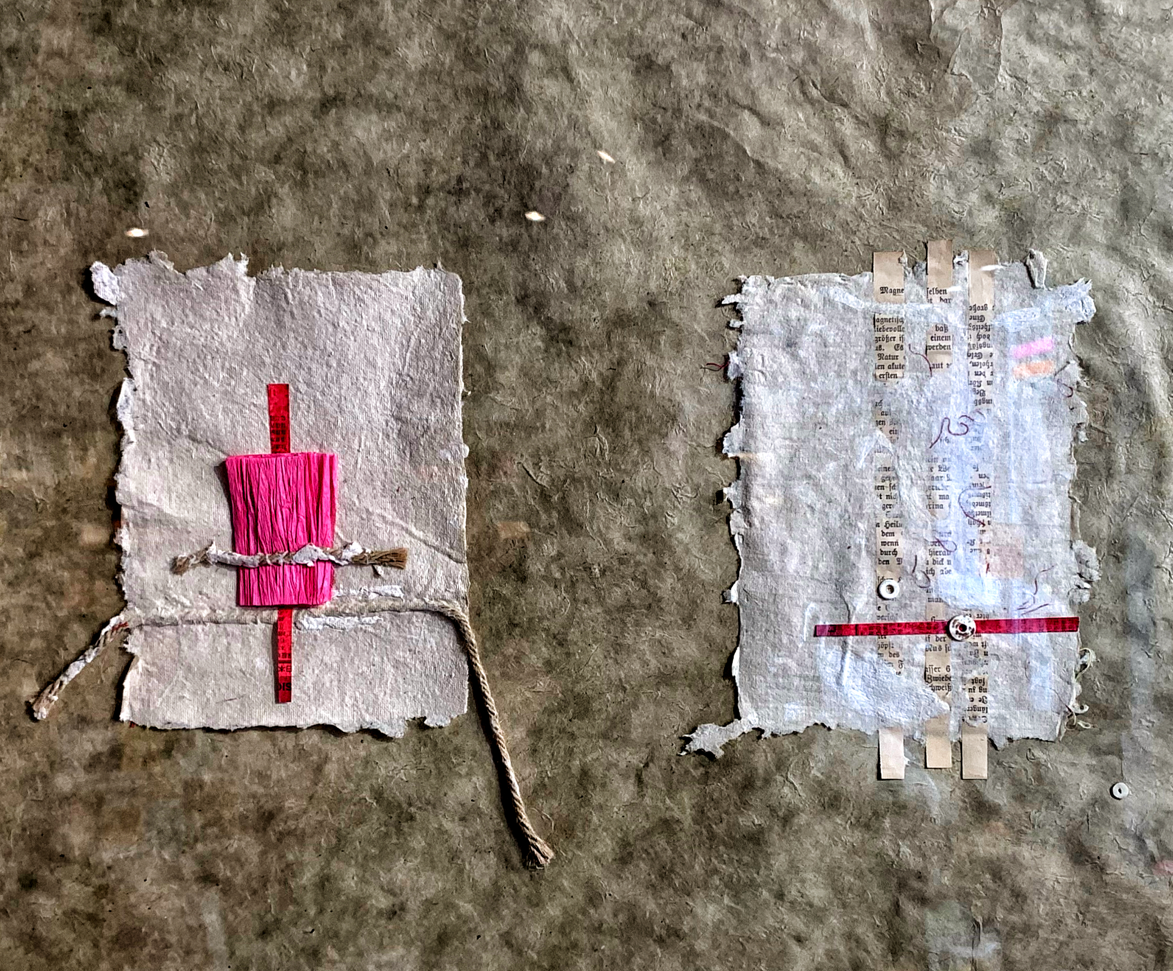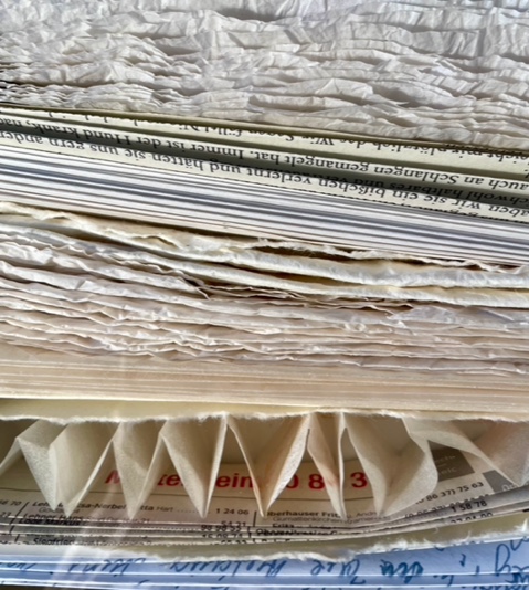 Die Liebe zum Papier machte mich neugierig darauf, es auch mal mit der Herstellung zu versuchen, also Papier zu schöpfen: Papierschöpfen, eine wunderbare Art des Recycling. Alte Papiere (von Zeitung bis Geschenkpapier) werden gerupft, in Wasser gekocht, „püriert“, durch’s Sieb gegossen, u.U. mit anderen Materialen (Blüten, Blätter, Briefe, Pigmenten) kombiniert, gepresst und dann getrocknet … macht Spaß, wenn dann etwas völlig Neues oft auch Überraschendes entsteht. (Ist aber auch ne große Sauerei). Auch aus z.B. Brennnesseln kann Papierartiges hergestellt werden.
